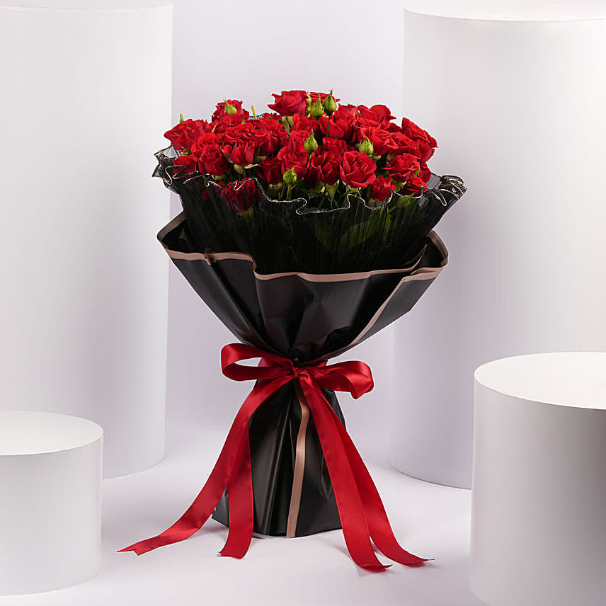 Wrapped in mystery and illuminated with warmth, this stunning bouquet of spray red roses is a bold expression of love and admiration. Each delicate red bloom symbolizes deep passion, beautifully gathered and wrapped in sleek black plastic and elegant black LED light wrapping paper that softly glows, creating a captivating visual contrast. The rich red ribbon adds a graceful finishing touch, enhancing the bouquet’s dramatic charm, while the signature FNP tags seal it with authenticity and care. Perfect for romantic surprises, heartfelt confessions, or unforgettable celebrations, this arrangement is where timeless romance meets modern elegance..