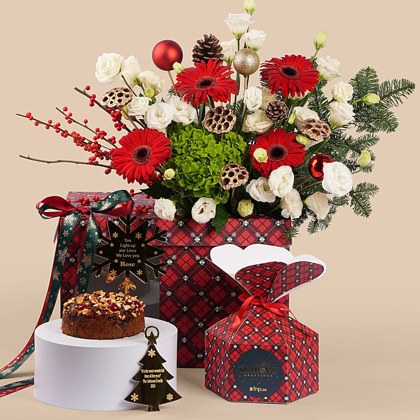 Make festive celebrations extra special with this luxurious Christmas floral and gift combo, beautifully arranged to spread joy, warmth, and holiday spirit. Featuring vibrant red gerberas, elegant white lisianthus, lush green hydrangea, and seasonal foliage, this arrangement creates a rich and cheerful holiday display. Accented with red and gold baubles, pinecones, and golden lotus pods, it brings classic Christmas elegance to any setting. The combo includes a delicious plum cake and two festive gold acrylic cutouts, making it a complete gifting experience. Presented in a stylish Christmas print combo box decorated with themed ribbons, this set is perfect for gifting loved ones or enhancing festive décor.
