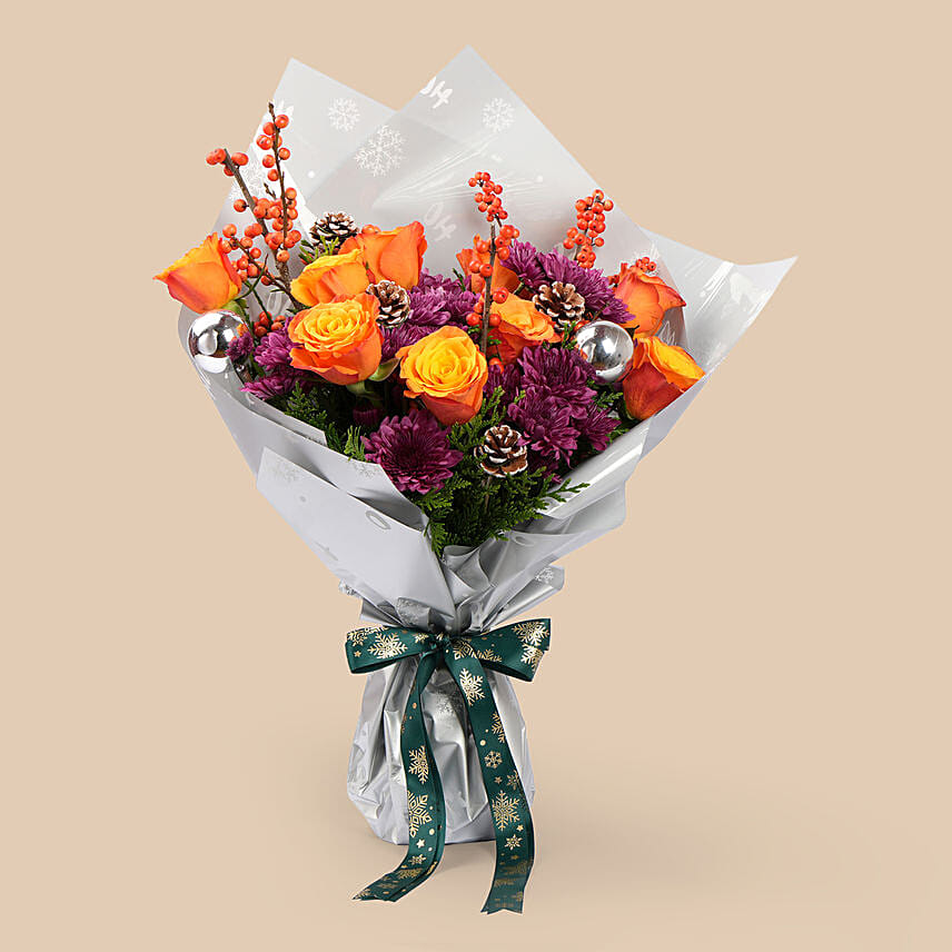 • Features : Vibrant Combination of Roses, Chrysanthemums & Festive Accents; Perfect for Gifting or Holiday Decoration