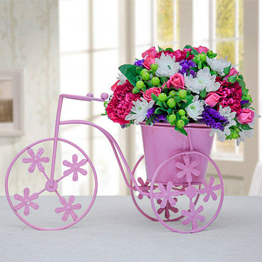 You can put this cute pink cycle arrangement anywhere in your bedroom or drawing room. Get this floral arrangement from Ferns N Petals for gifting your loved ones. 8 dark pink carnations, 15 white chrysanthemums, 10 pink spray roses and purple statice are organized gorgeously to decorate the pink cycle.