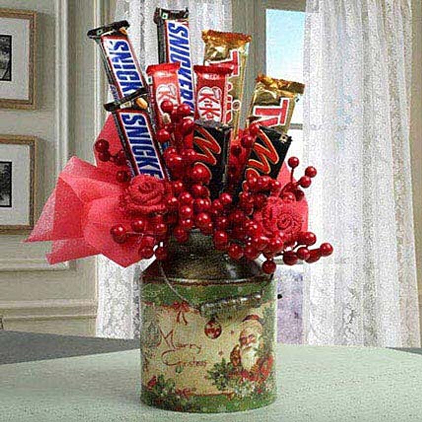 Gift a sweet surprise this Christmas. Chocolates are the all-time cherished gifts by every age group. So, it makes a deadly combination when you find KitKat, Snickers, Twix with delicious red berries in a single arrangement. Also, red jute flowers make it a definite buy.