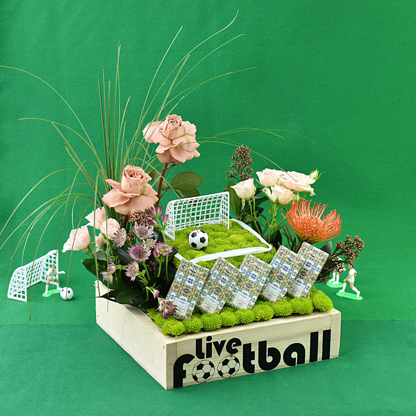 Arranged representing a football field, this wooden box décor piece is a treat for your tastebuds and eyes. It contains beautiful flowers with premium chocolates, a perfect gift for football lovers.