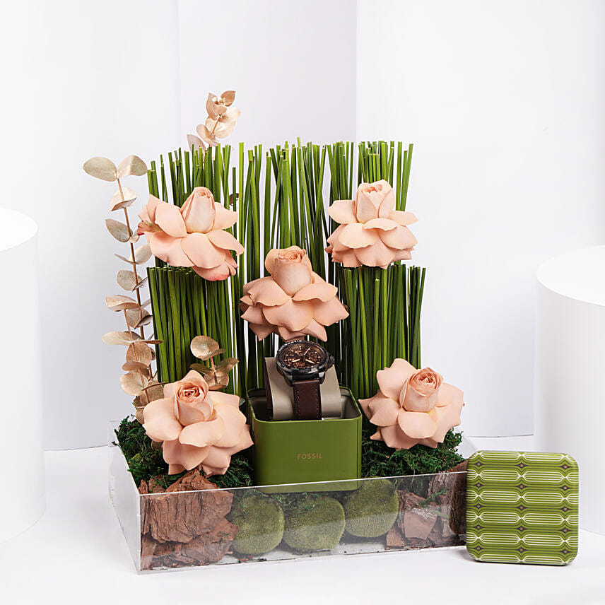 This exquisite gift set brings together the charm of nature and the sophistication of a timeless watch. Featuring peach roses, bamboo-like greenery, and gold accents, it’s a perfect choice for someone who appreciates elegance and the harmony of natural beauty with modern style.