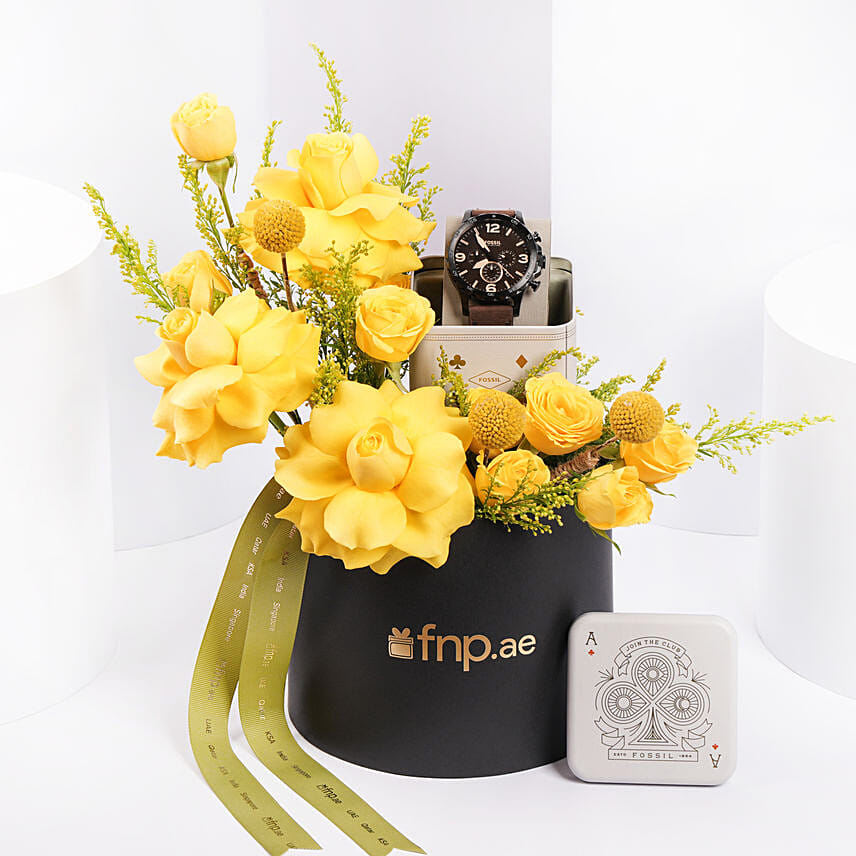 This lively gift set combines the radiant charm of yellow blooms with the refined elegance of a classic watch. It’s the perfect choice for someone who brings warmth and positivity to every moment, making it ideal for celebrating life’s happiest occasions.