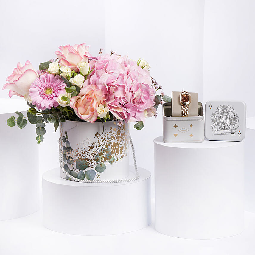 Celebrate life precious moments with this elegant floral arrangement paired with a luxury watch gift set, curated to express love, gratitude, and admiration. This gift embodies the perfect blend of natural beauty and timeless sophistication, making it ideal for any special occasion.