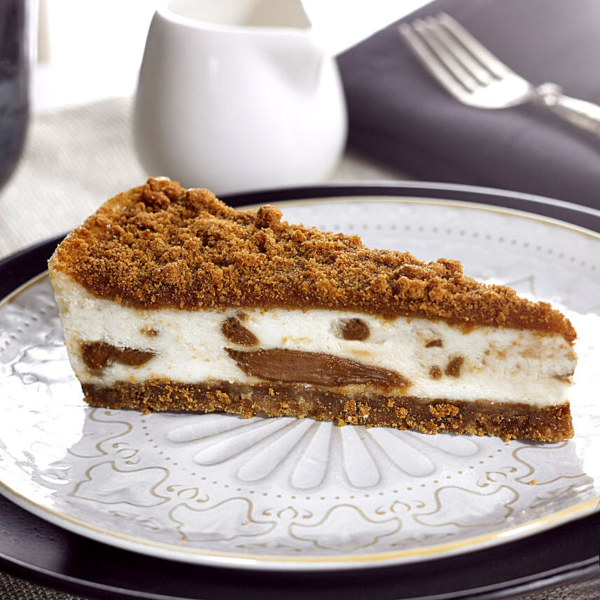 • Crisp speculoos biscuit base, topped with a baked coconut vegan cheesecake and spiralled with speculoos biscoff sauce