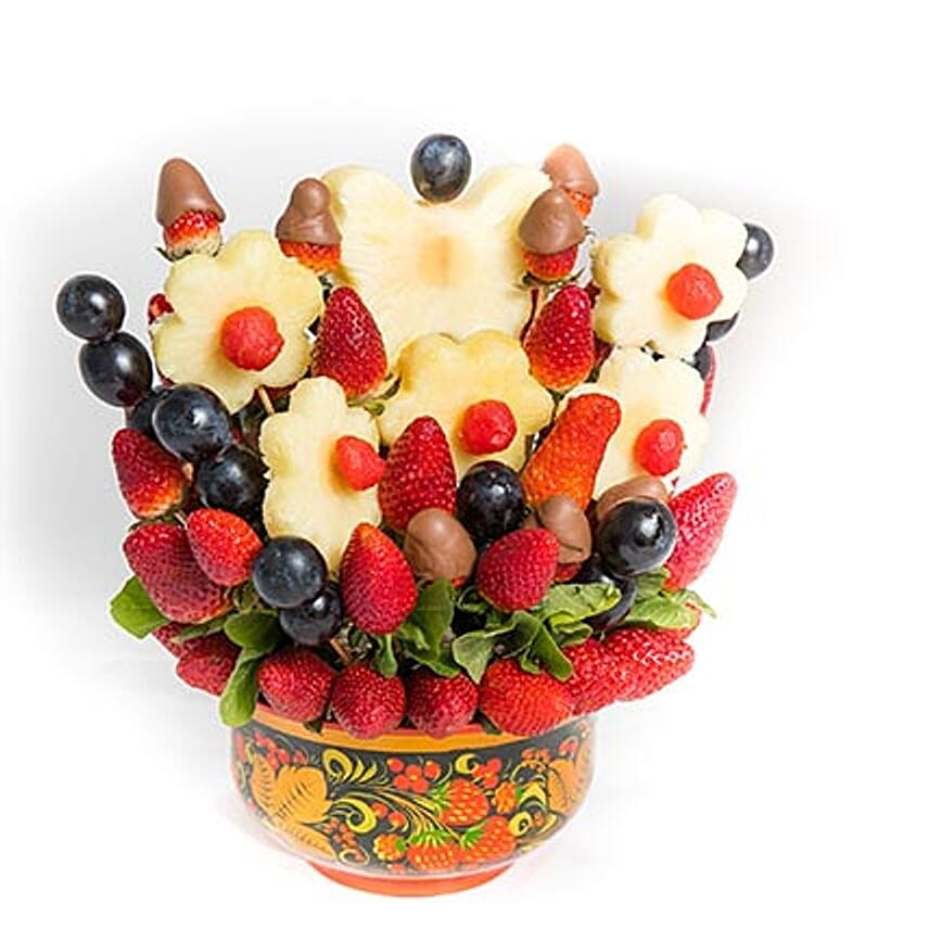 Fresh strawberries, grapes, pineapple and watermelon with some strawberries dipped in pure Belgium chocolate. The smell of fresh fruits, the vibrant colors will make this bouquet an irresistible indulgence. Wish health, happiness and success with this bouquet of fruits