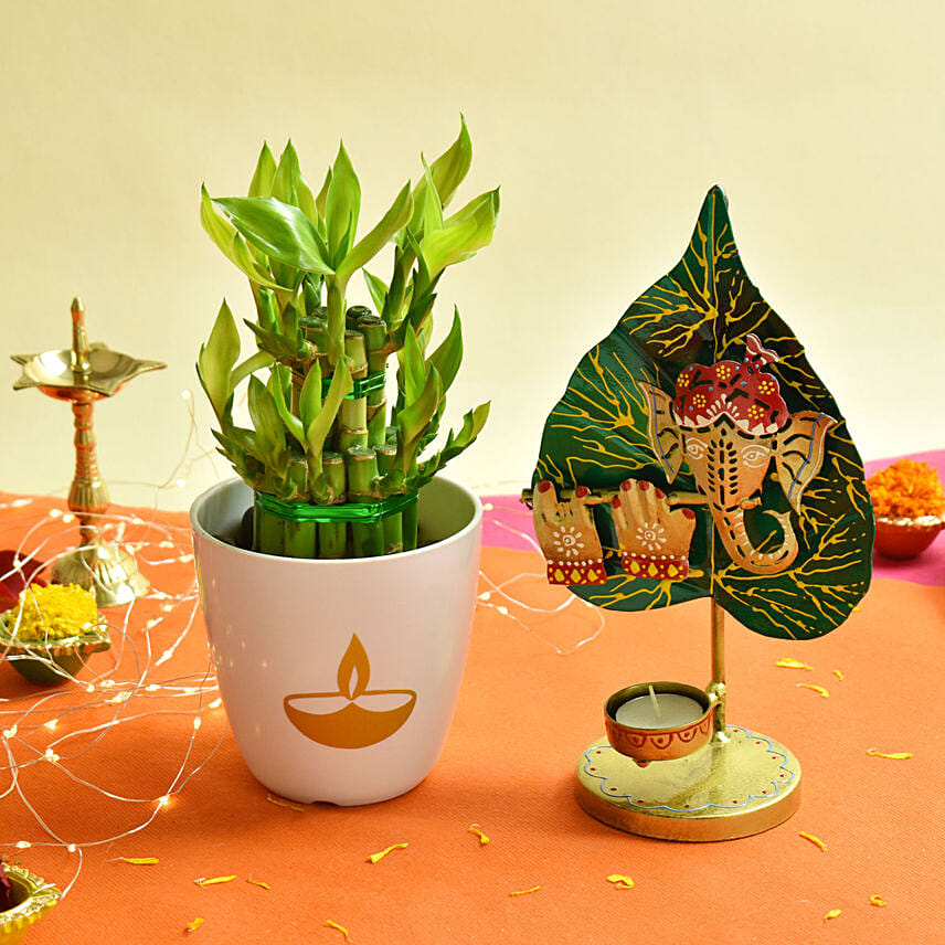 Traditions and beliefs in the form of Flute Ganesha Tea Light Holder & Bamboo Plant combo is just perfect to send across to your loved ones. It is an auspicious and alluring addition to any religious setting. A great exchange of good wishes for the festive season.