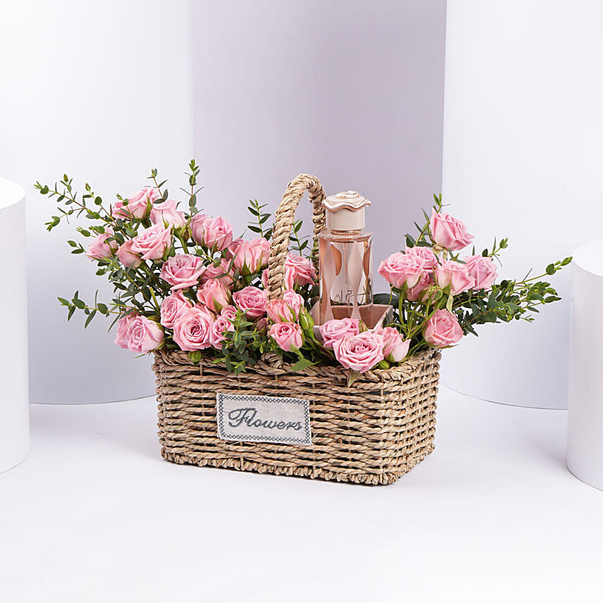 Delight in the romance and charm of this beautifully curated floral basket, featuring soft pink roses paired with an elegant fragrance. Nestled in a rustic woven basket, this arrangement embodies the grace of nature and the allure of fine perfume, making it the perfect gift for someone who appreciates both beauty and sophistication. Ideal for birthdays, anniversaries, or simply to brighten someone’s day, this gift brings a touch of elegance and joy, reminding them of life’s sweet and fragrant moments.