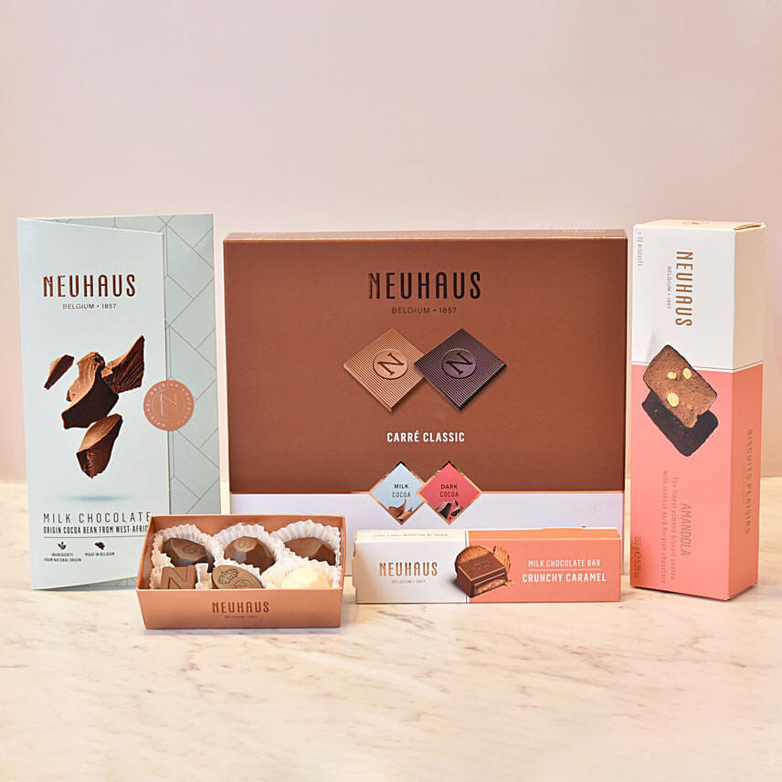 • This elegant gift box is filled with: Carré Classic Milk and Dark (40 pieces), Biscuits Amandola, Tablet Plain Milk 100G, Crunchy Caramel chocolate bar and ballotin with 6 pralines.