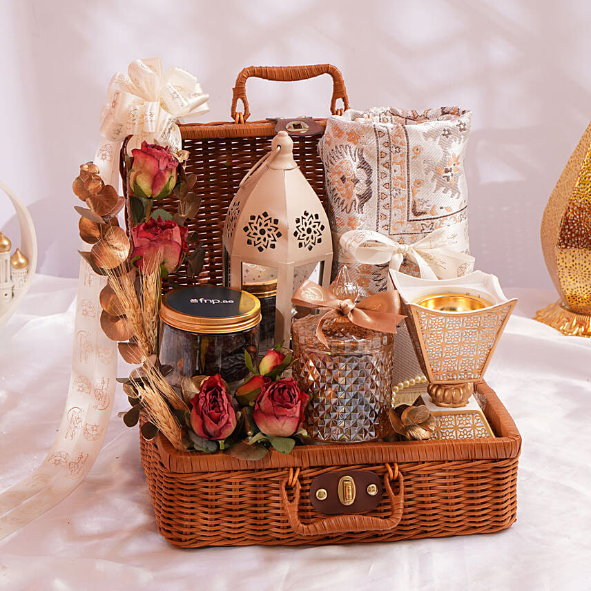 Celebrate the essence of Ramadan with this beautifully curated brown suitcase basket, thoughtfully designed to blend spirituality, tradition, and elegant presentation. This refined arrangement features a prayer mat with prayer beads neatly packed in a pouch, symbolizing reflection and devotion during the holy month. A decorative Ramadan metal lantern and censer add a warm, aromatic ambiance, while transparent glass jars hold classic dates and bakhoor for a traditional touch. Accented with artificial red roses, dried florals, eucalyptus filler, and finished with premium wrapping elements and ribbon, this basket makes a meaningful and graceful Ramadan gifting choice.