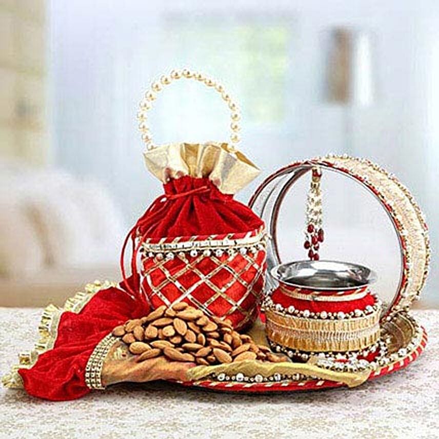 Fasting on the day of Karwa Chauth enhances the quality and longevity of the husband's life. But, why not to care about the wife's health? Keeping this in mind, the offered combo is designed to deliver the Sargi, not only to complete the rituals, but also to enhance the health of the fasting wife. Your Gift Contains:Red & Golden Thali Set (Thali Diameter 12 inches,channi Diameter 7.5 inches, Vessel Diameter 4 inches,Potly 9 inches height, Thali Cover),Almonds 100gms
