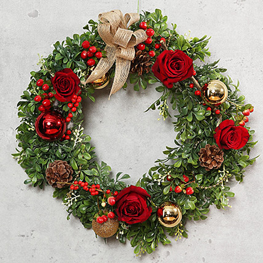 Christmas Wreaths are circular in shape which signifies eternity. It represents an unending circle of life which is life, joy and sacrifice or forgiveness. Embrace the spirit of Christmas with this beautiful Christmas Wreath decorated with red roses, red berries & a beautiful ribbon bow.