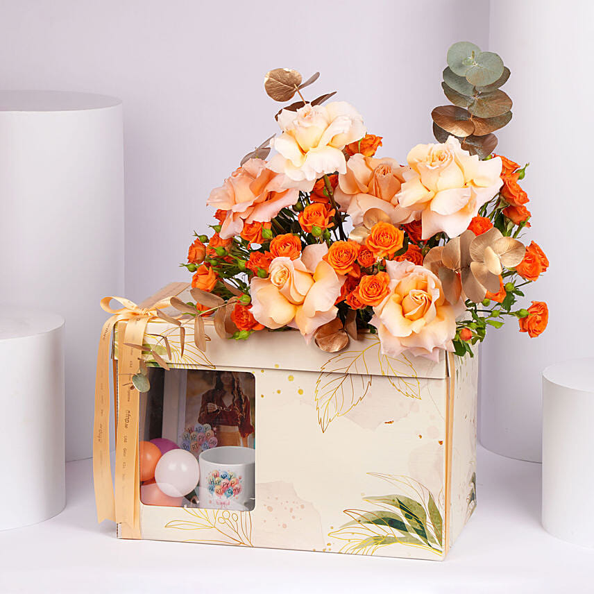 Make birthdays extra special with this exquisite floral gift box showcasing a delightful combination of 6 peach garden roses and 7 orange spray roses, elegantly accented with golden eucalyptus. Arranged beautifully atop a premium designer box, this charming set includes a personalized “Happy Birthday” acrylic frame and a matching “Happy Birthday” mug inside. You can also personalize the gift box with a custom name, making it an unforgettable keepsake for someone’s special day.