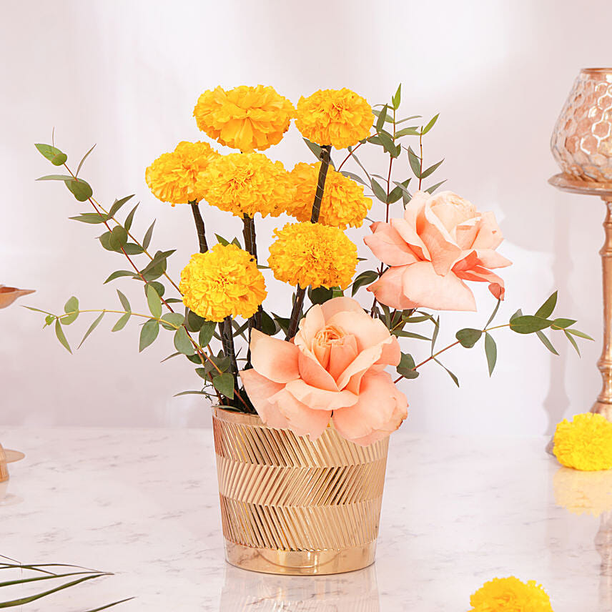 Celebrate Diwali with a radiant arrangement of marigolds the most auspicious flower of the festival. Paired with graceful steel grass fillers and elevated by a shimmering gold acrylic accent, this creation is presented in a sleek transparent fishbowl vase. A true symbol of prosperity, joy, and festive charm, this centerpiece is perfect for adding a traditional yet modern touch to your Diwali décor or gifting.