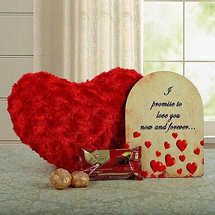 This romantic combo of red heart soft toy, Alpino chocolate, and a tabletop is perfect to delight your partner with happiness and bring a sweet smile on their face. The magical words on the tabletop "I promise to love you now and forever" will win the heart of your beloved and yummy chocolates will relish their taste buds.