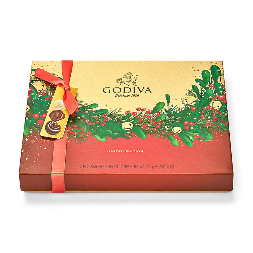Celebrate the Holidays with a 20-piece gift box filled with Godiva chocolates of your choice, from premium Truffles, Pralines, and Ganaches