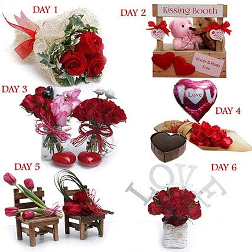 Day 1: Bunch of 3 red roses with ivy leaves wrapped in natural colour jute mat with red organza ribbon. Day 2: Get a 6x6 inch wooden kissing booth with a pair of 2 inch teddy bear. Day 3: 2 mason handle jar arrangements one with 6 red roses , 6 pink roses with ceramic Mr.&Mrs hearts and other one with 15 red roses with 2 ceramic love birds and 2 red heart shape candles. Day 4: Bunch of 12 red roses wrapped in brown paper with 1 I love you balloon and 8 portion heart shape chocolate cake. Day 5: 2 Small wooden chair one with 4 red tulip and other one with 3 red roses and flexi grass. Day 6: Cane weave vase arrangement with 18 red roses and wooden love alphabets.