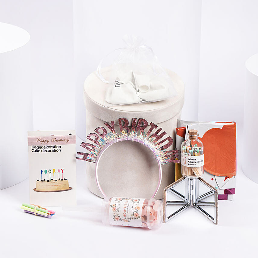 • Make her day of celebrations complete with this gorgeous box of balloons, confetti, flame candles, mega birthday cake balloons and so much more for a fantastic birthday!