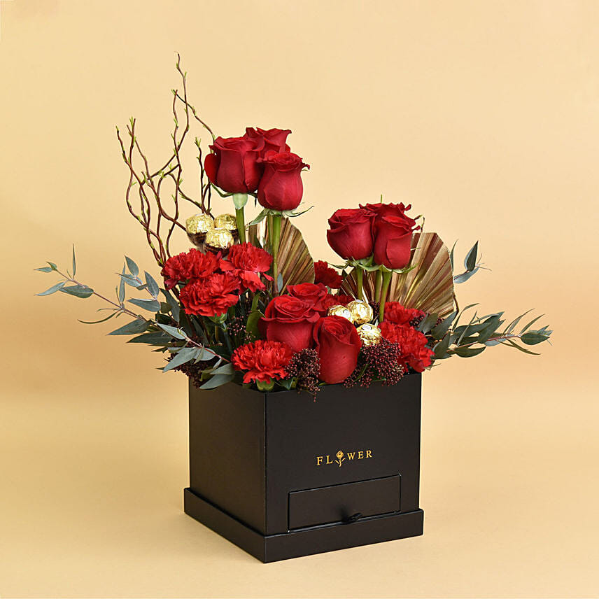 Keeping in mind the colour of love - Red, here is an arrangement of luxury flowers to shower your special one with all the affection. The classic way of declaring your love will never go out of style, so gift your beloved this lovely box of flowers and chocolates and watch them smile ear to ear.