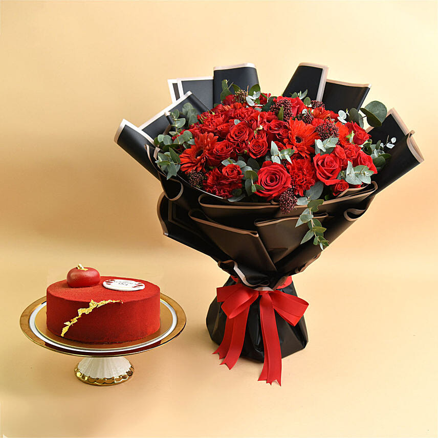 Luxury flowers wrapped and tied elegantly come with a decadent cake to celebrate love. The sheer look of this delightful gift will make your beloved fall for you more. Let their senses be overwhelmed with your deep emotions perfectly captured in this gift.