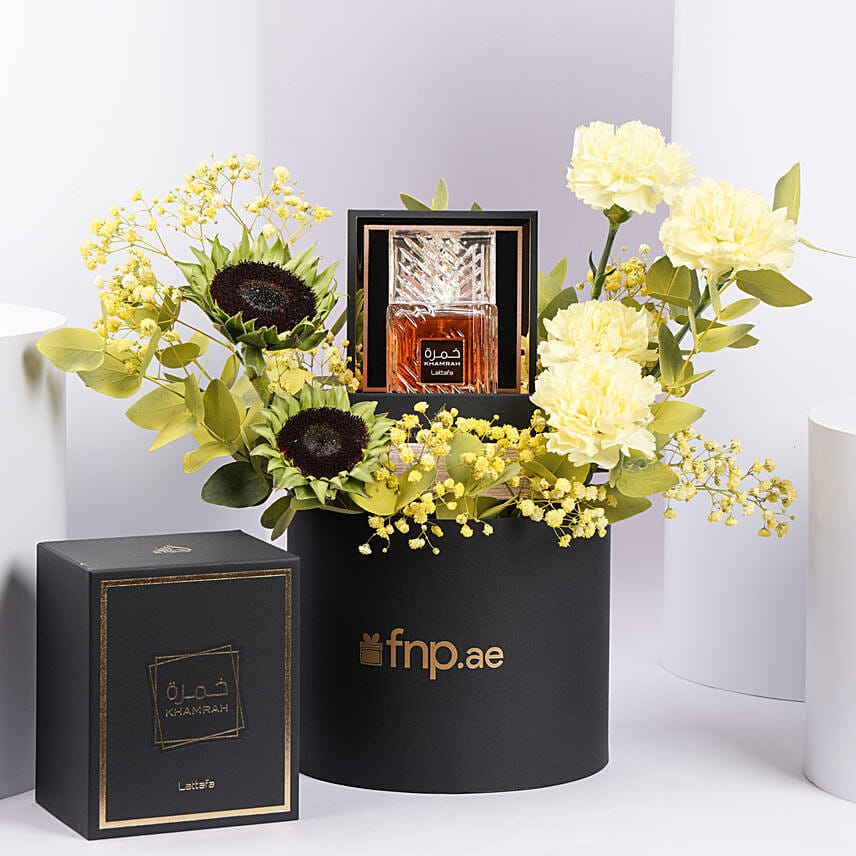 Introduce someone special to the opulence and mystique of the Middle East with this refined gift set. Featuring the Khamrah fragrance by Lattafa, known for its warm and captivating notes, this arrangement is surrounded by elegant yellow blooms and rich greenery. Designed for those who appreciate the finer things, this gift embodies sophistication and timeless beauty. Perfect for celebrating milestones or expressing deep appreciation, this gift combines the art of fragrance with the beauty of nature, creating a sensory experience that lingers in memory.