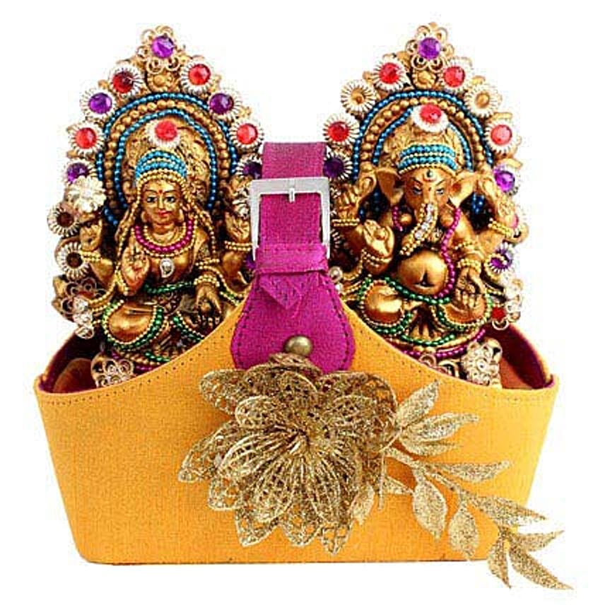 Send your loved ones the blessings of lakshmi ganesha. On this auspicious occasion, gift them idols of the gods in this breathtakingly beautiful basket embellished with rich golden, laser cut flower motif.