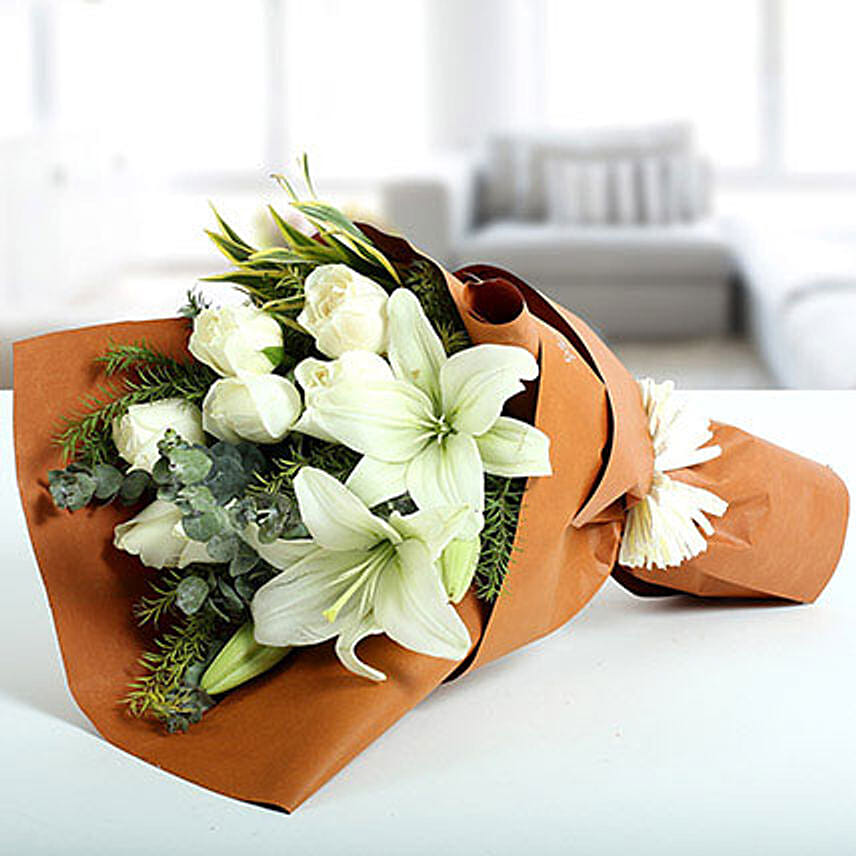 • 2 White Asiatic Lily, 6 White Roses, 2 Song of India Leaves, 4 Eucalyptus, 2 Beige FNP Printed Paper, White Rassi, 1 Bottle Bush Green