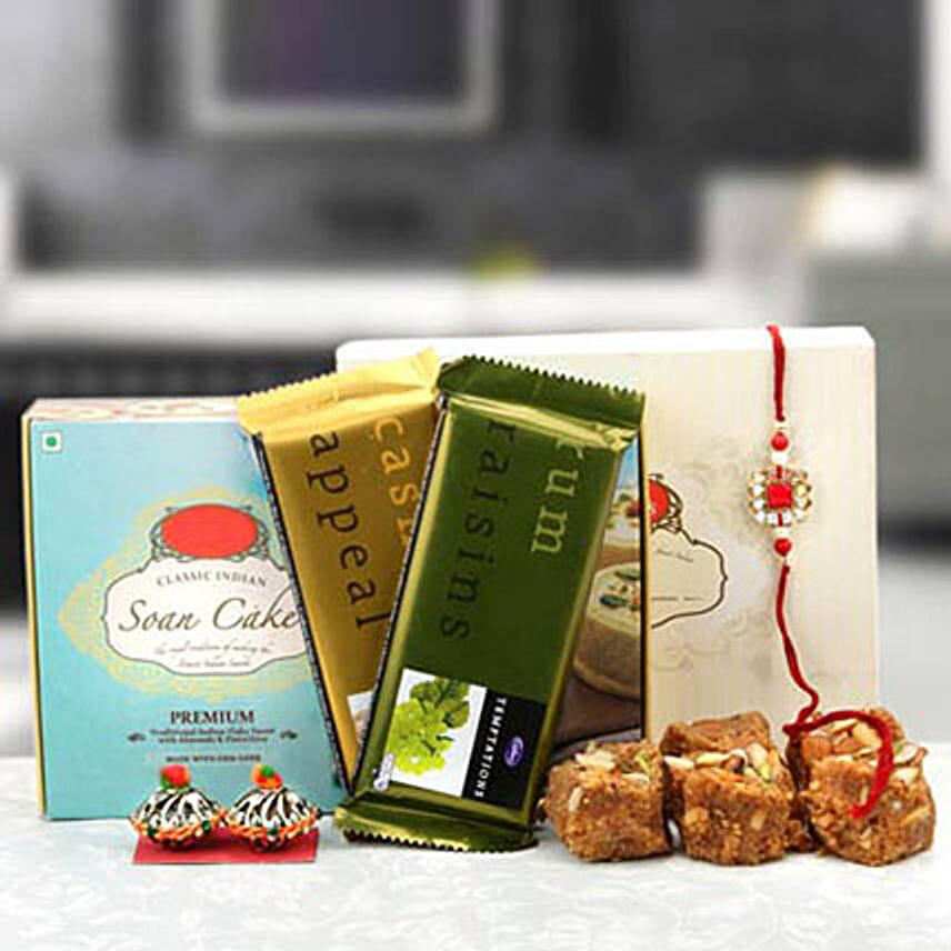 A fantastic combination of mouth-watering chocolates and traditional sweet, Pinni is surely going to make your brother crave for more and more. Along with this delightful food items combination, it consists of an elegant Rakhi that will effortlessly look cool and beautiful on the wrist of your adorable brother.