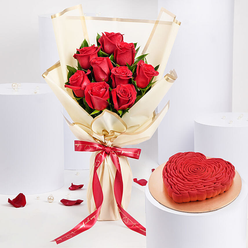 Love Expression 9 Roses Bouquet With Heart Shape Cake