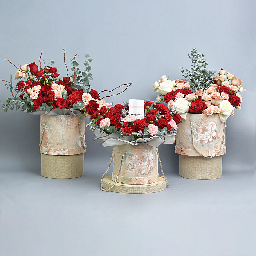 A set of floral box arrangements with perfume to make the grand gesture of love. Engulf your loved one in the charm of premium roses and carnations arranged beautifully in designer boxes. A gift that will cloud their senses with your love and loyalty.
