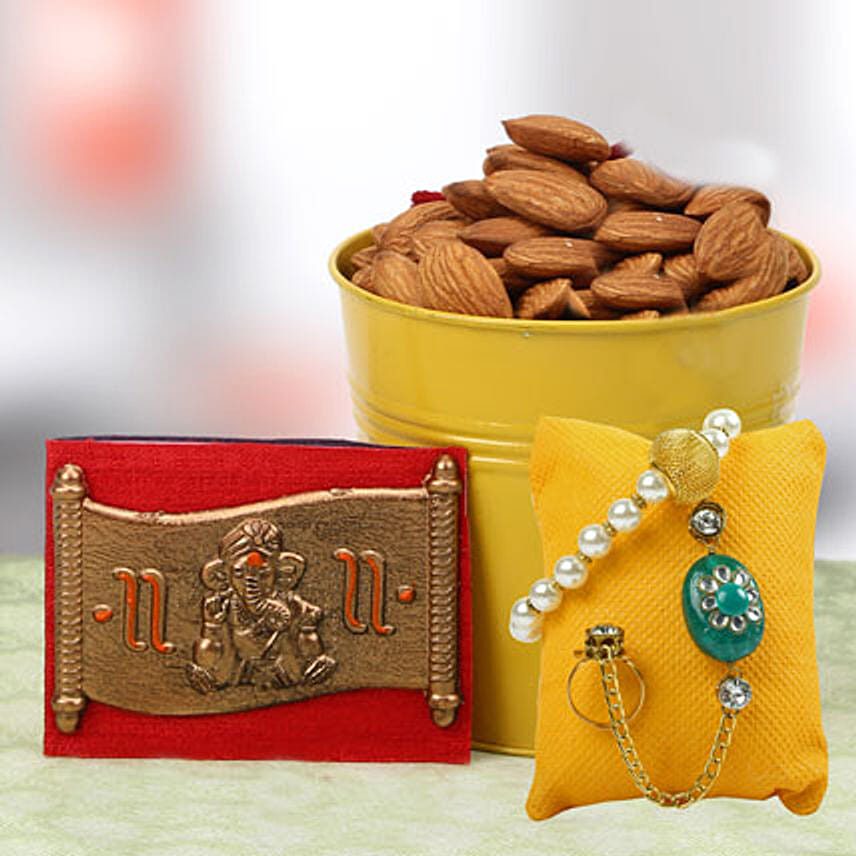 Almonds are good for a healthy heart, mind, and body. This gift hamper consists of a Small bucket filled with almonds, a ravishing rakhi, and a golden Ganesha frame. So, good luck is sure to be showered on your brother with this hamper!