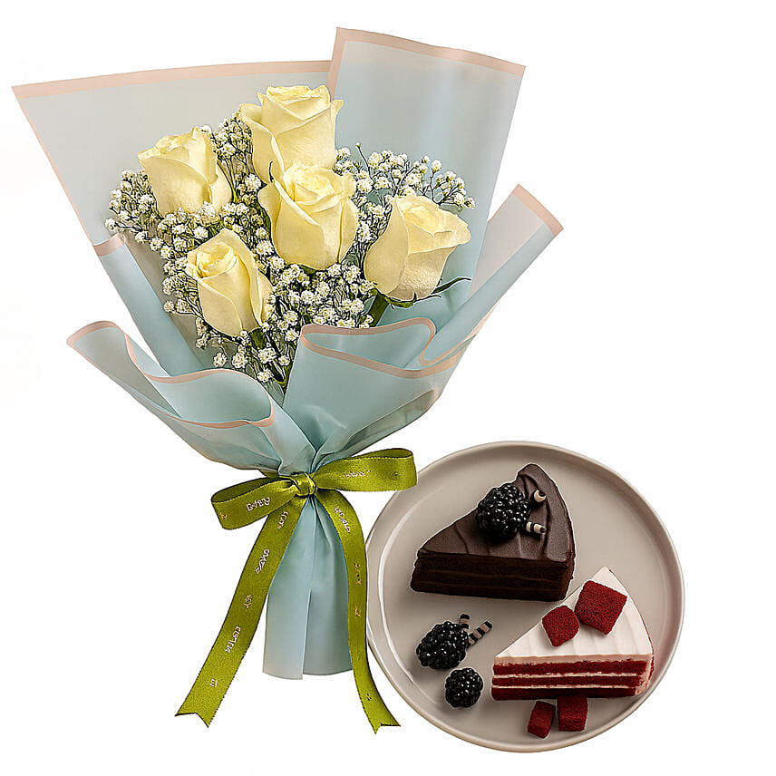 Luxe Ivory Roses with Red Velvet And Truffle Slice Combo