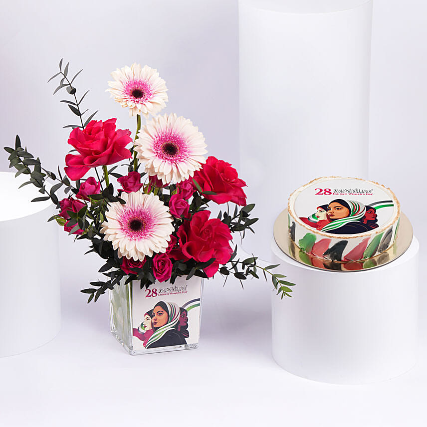 Luxury Emirati Womens Day Flower Arrangement With Cake
