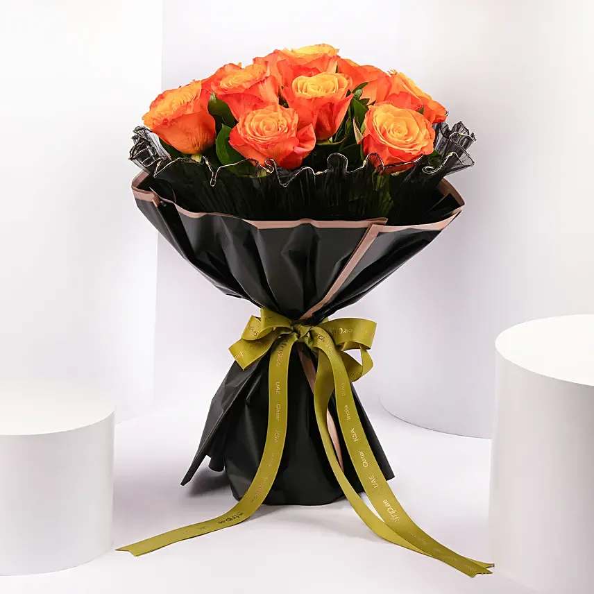Vibrant and full of energy, this captivating bouquet of orange roses beautifully expresses enthusiasm, admiration, and heartfelt warmth. Each radiant bloom bursts with lively color, symbolizing passion, excitement, and positivity. Carefully arranged and wrapped in sleek black plastic wrapping, the bouquet is further enhanced with a black Led sheet wrapping that emits a soft glow,creating a striking contrast against the fiery orange petals. Finished with the signature FNP green ribbon, this arrangement blends modern elegance with bold charm. Perfect for celebrating achievements, uplifting someone’s spirit, or expressing admiration, this bouquet is a glowing expression of joy and vibrant emotions.