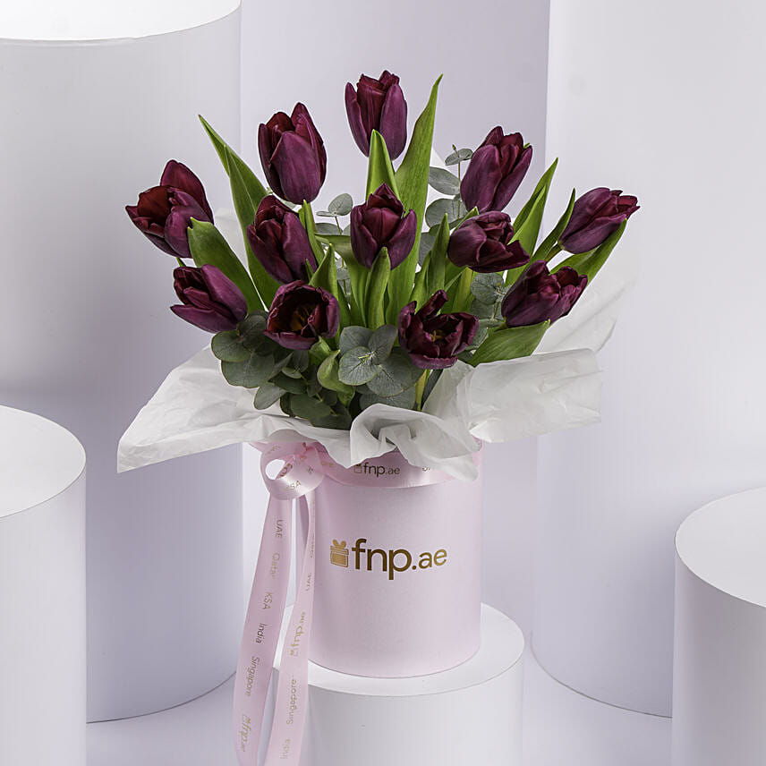 Celebrate the love and strength of the most special woman in your life with this bold and elegant tulip arrangement — perfect for both Mother’s Day and Women’s Day. Featuring twelve stunning Dark Purple Tulips, this arrangement radiates grace, admiration, and heartfelt appreciation. Complemented with fresh Cinerea Eucalyptus for a natural touch of greenery, the blooms are beautifully styled in a chic pink box, creating a sophisticated and meaningful floral gift.