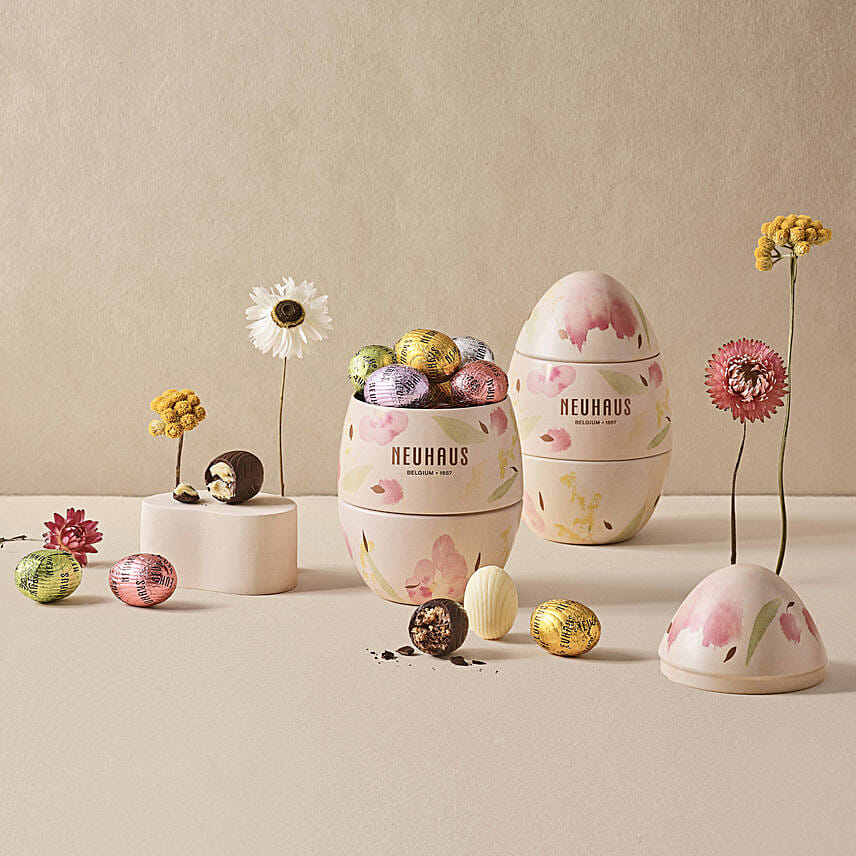• The Metal Easter Egg contains +/- 18 Neuhaus Easter eggs in dark, milk and white chocolate. This egg-shaped box crafted in a colourful metal with a floral print is the perfect gift for chocolate lovers or ideal to enjoy as a self-treat.