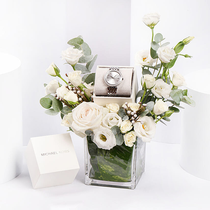 This exquisite arrangement featuring a Michael Kors watch nestled among elegant white flowers in a sleek glass vase is a refined gift that conveys grace and sophistication.