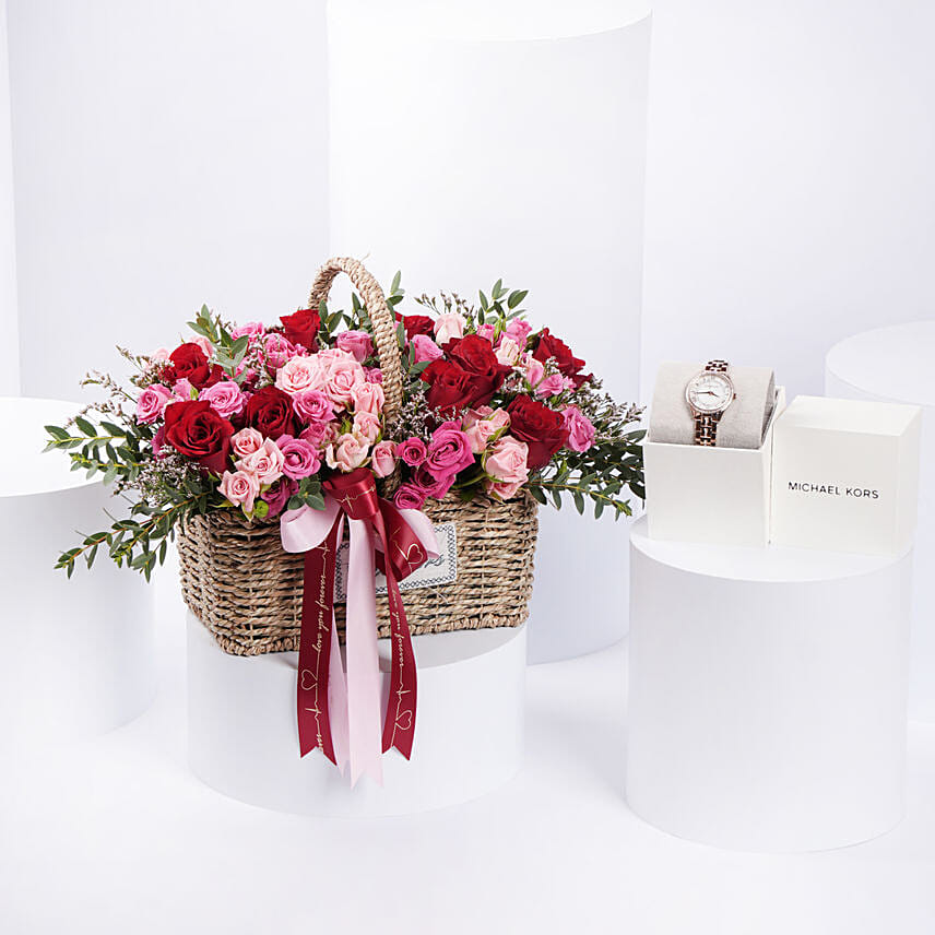 When words aren’t enough to express your feelings, let this luxurious floral basket paired with a Michael Kors watch speak for you. This thoughtful combination is perfect for conveying love, appreciation, and admiration, making it ideal for milestone celebrations and heartfelt moments.