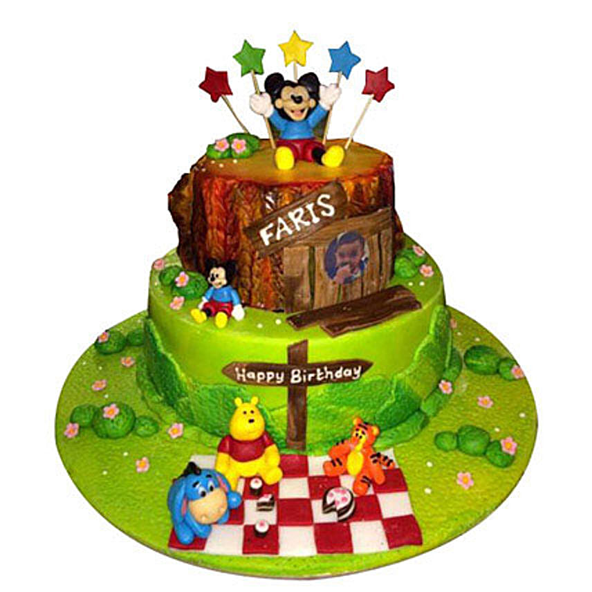 A two tier cake is decorated by our cake artists and the lovers of Mickey Mouse and Winnie – the Pooh would simply drool over this cake for sure. You can find a Mickey Mouse, Winnie – the pooh, Tigger, and Eeyore on this heavenly cake.