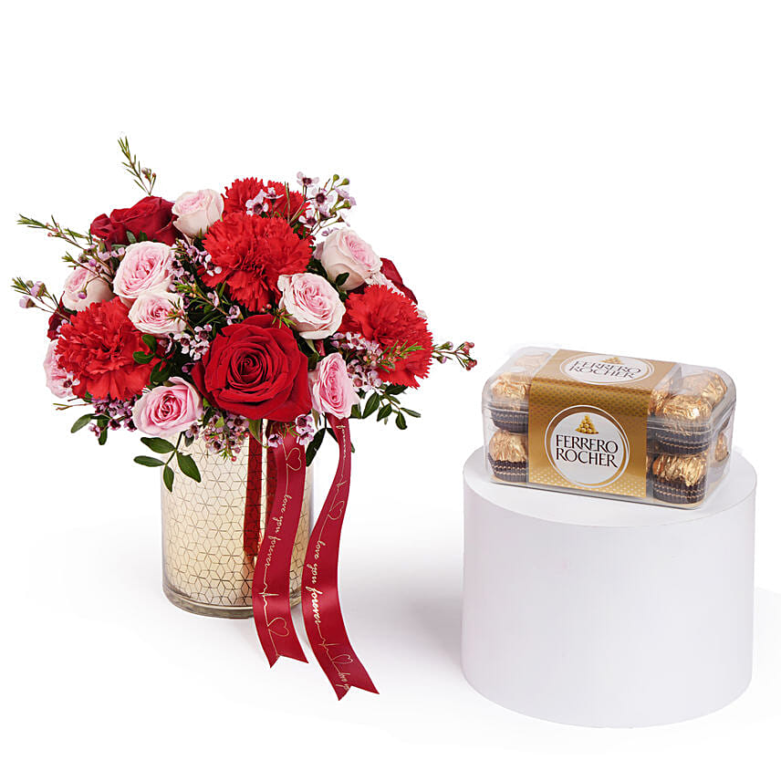 Mix Roses in Golden Vase with Ferrero Rocher Combo