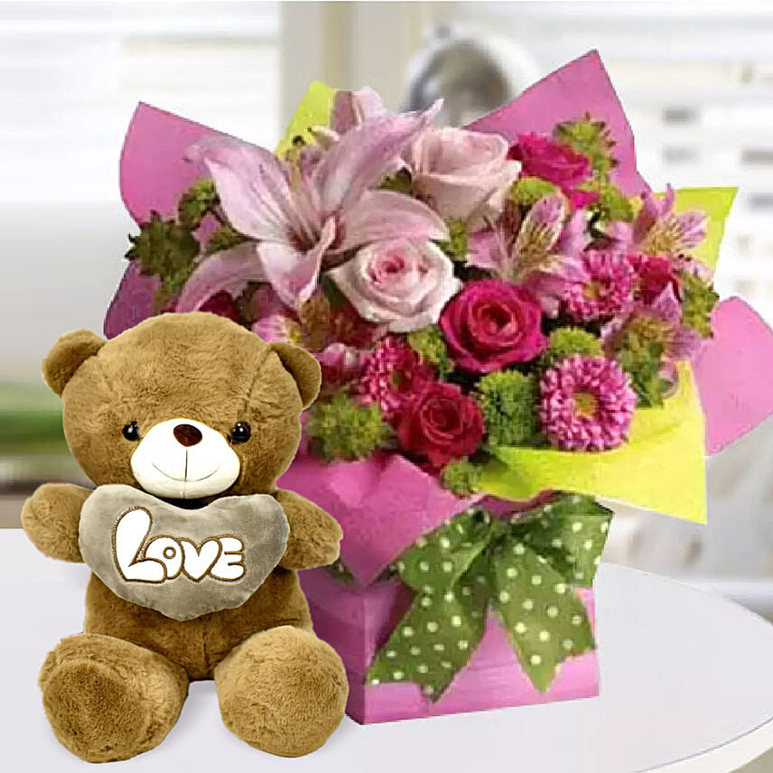 Being in love is a magical feeling that needs to be expressed in the most romantic manner. This fabulous combo of mixed flowers and white teddy will speak the language of love to that special someone and impress them to the core. Order it online to say what words fail to convey.