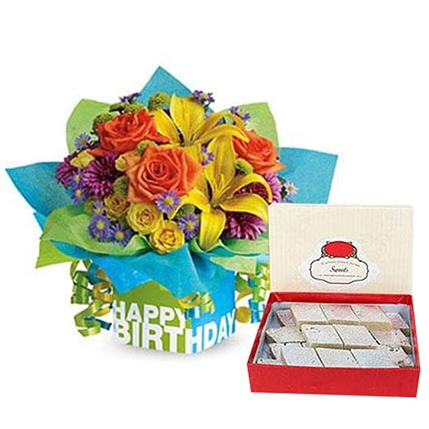 Mixed Flowers Arrangement and Kaju Katli Combo