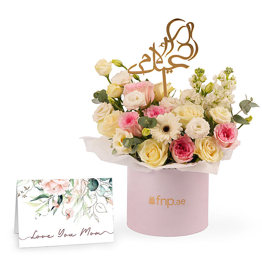 • A vibrant mix of garden flowers arranged in a premium box paired with a “Love You Mom” gift card for a cheerful and heartfelt celebration gift.