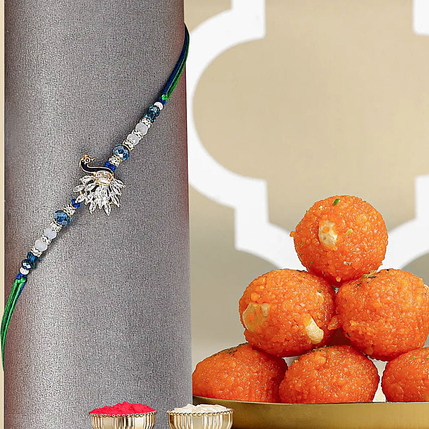 Mystic Harmony Peacock Rakhi N Motichoor Laddoo