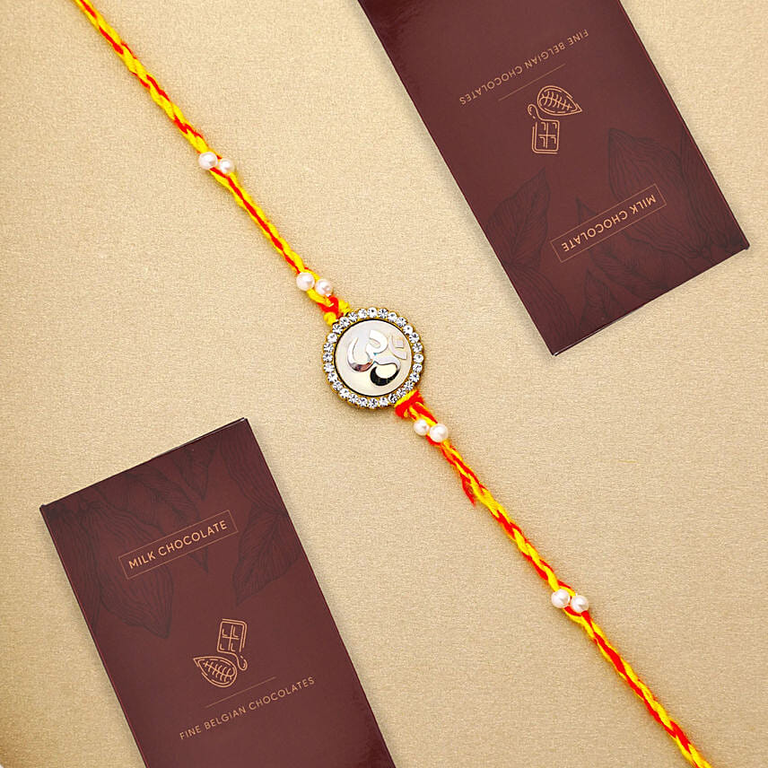 Embrace spirituality with our Om Rakhi, where the sacred symbol rests upon threads of vibrant red and yellow hues. Perfect for the brother who seeks inner peace and wisdom, this rakhi embodies the essence of divine protection and harmony. The red symbolises strength and vitality, while the yellow signifies positivity and enlightenment. Gift this rakhi to your brother, symbolising your wish for his well-being and spiritual growth, as he embarks on life's journey with courage and grace.
