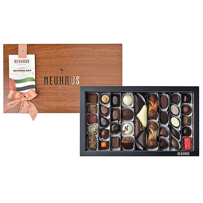 • The National Day Wooden Hosting Box contains -/+ 39 of Timeless Masterpieces that includes a selection of praliné, ganache, truffles and gianduja filled pralines.