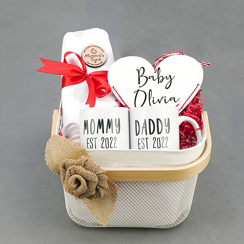 A perfect hamper for those who have just stepped into parenthood. The hamper consists of towel, printed coin & a heart shaped cutout with the baby's name along with the mommy daddy printed mugs.