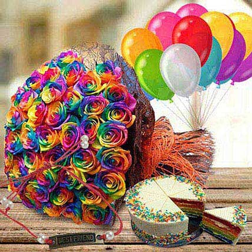 Bunch of rainbow roses wrapped in brown jute mat and paired with rainbow cake and mix color balloons are the best way to convey your true feelings to anyone in most romantic way With Friendship Band.