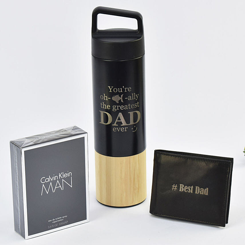 Send across this Personalised Bottle, Leather Wallet & CK Perfume combo to thank your dad for all the times when he stood by you against all odds.